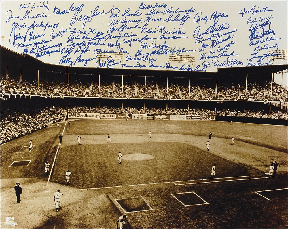 Glossy 20 x 16 photo of several of the Dodgers rounding the bases after a grand slam, signed in blue felt tip by 48 former Dodgers, including: Duke Snider, Johnny Podres, Clem Labine, Pee Wee Reese, Preacher Rowe, Jim Gentile, Bobby Bragan, Harry Taylor, Bob Borkowski, Eddie Basinski, Al Gionfriddo, Andy Pafko, Bob Kennedy, Tommy Holmes, and Joe Pignatano. In fine condition. Pre-certified Steve Grad/PSA/DNA and RRAuction COA.