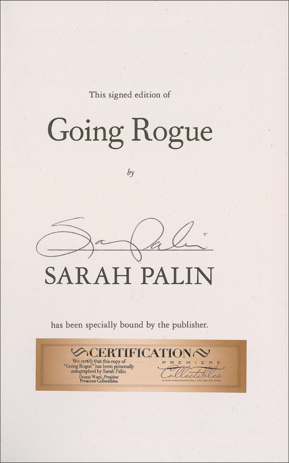 Signed book: Going Rogue: An American Life. Special autographed edition of first edition, later printing. NY: Harper Collins, 2009. Hardcover with dustjacket, 6.25 x 9.25, 413 pages. Signed on a special prefatory page in black ink. Book is housed in its original leather presentation box. In very fine condition. RRAuction COA.