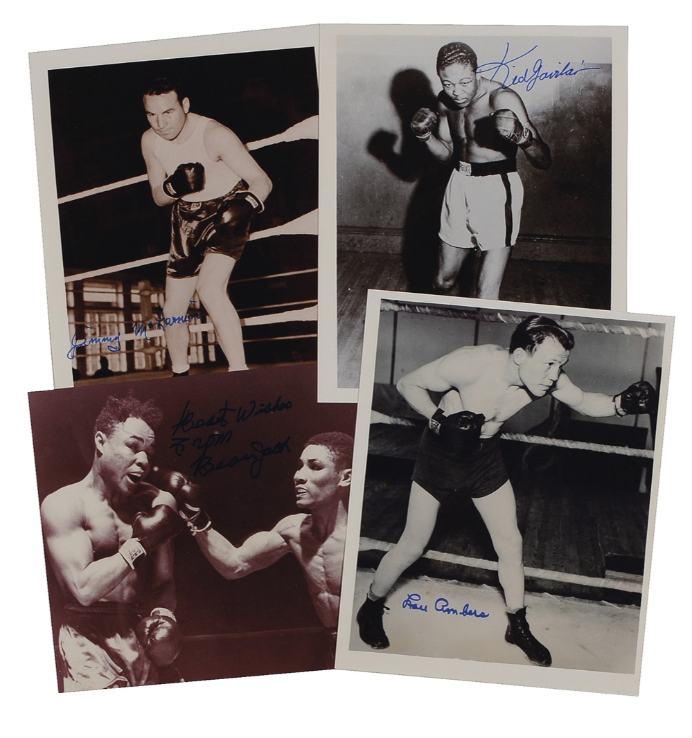 Four glossy signed boxing photos each signed in blue felt tip, including three 8 x 10 and one 10 x 8. Signers include: Beau Jack, Kid Gavilan, Lou Ambers and Jimmy McLarnin. In overall fine condition. RRAuction COA.