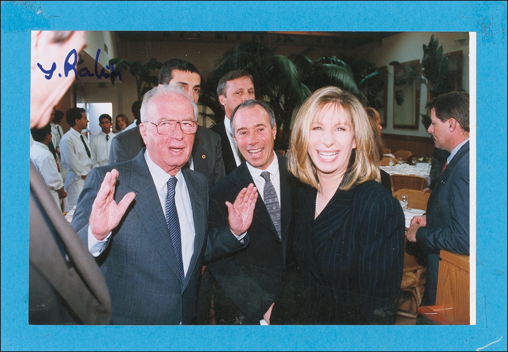 Color glossy 7 x 4.75 photo of Rabin engaged in conversation with Barbra Streisand standing next to him, signed in blue felt tip, “Y. Rabin.” Photo is affixed to a slightly larger blue sheet. In fine condition, with a bit of light contrast to end of signature and some light bends from adhesive on reverse. RRAuction COA.