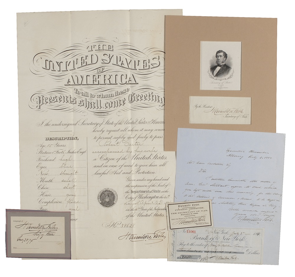 Six items: a one page DS, 12 x 18, being a passport for Robert Carter, signed at the bottom by Fish; an ALS dated July 2, 1850; a Diplomatic Corps pass for the funeral of the Secretary of War, signed by Fish as Secretary of State; an ink signature as secretary of state, clipped from a larger document and matted with an engraved portrait to an overall size of 8 x 10; an ink signature as secretary of state dated July 28, 1876; and a personal check, dated July 2, 1892, filled out and signed by Fish. In fine overall condition. RRAuction COA.