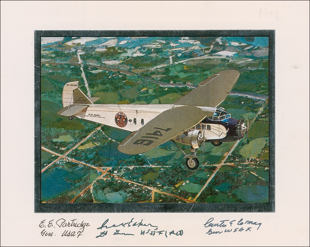 Color 8 x 6 print of a Ford Tri-Motor airplane, affixed to a 10 x 8 off-white mount, signed on the mount in black felt tip by Generals E. E. Partridge, Ira E. Eaker, and Curtis LeMay. In fine condition. RRAuction COA.