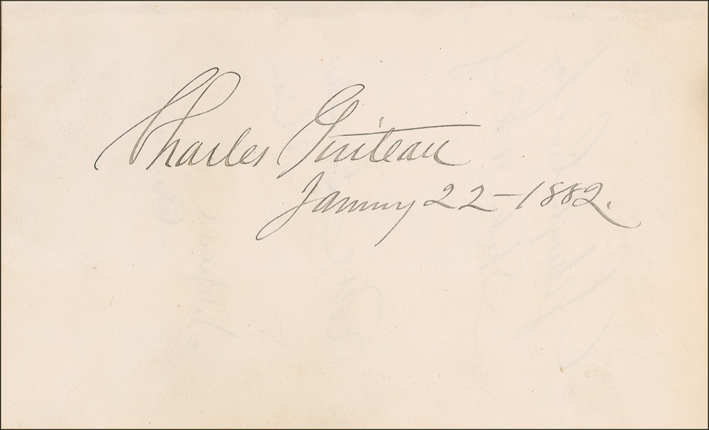 American lawyer (1841–1882) who, frustrated in his attempt to secure an ambassadorship, assassinated President James Garfield in 1881. Ink signature, “Charles Guiteau, January 22—1882,” on an off-white 7.5 x 5 album page. In fine condition, with light show-through from adhesive and signatures on reverse. Pre-certified PSA/DNA and RRAuction COA.