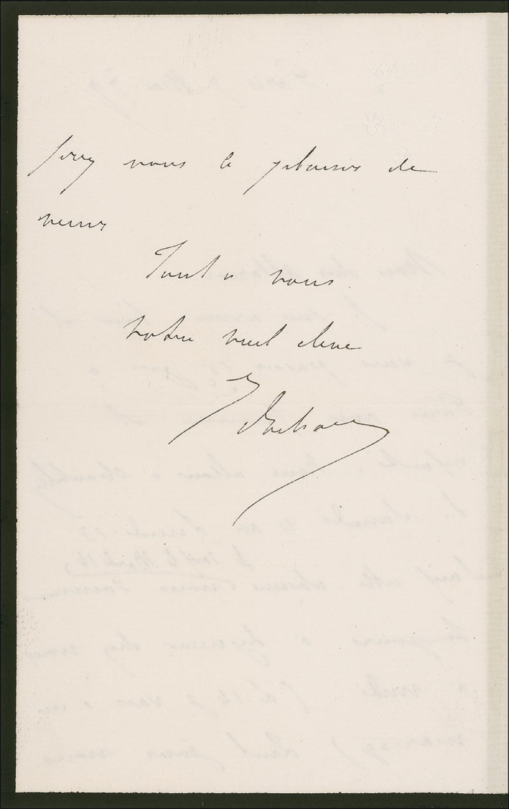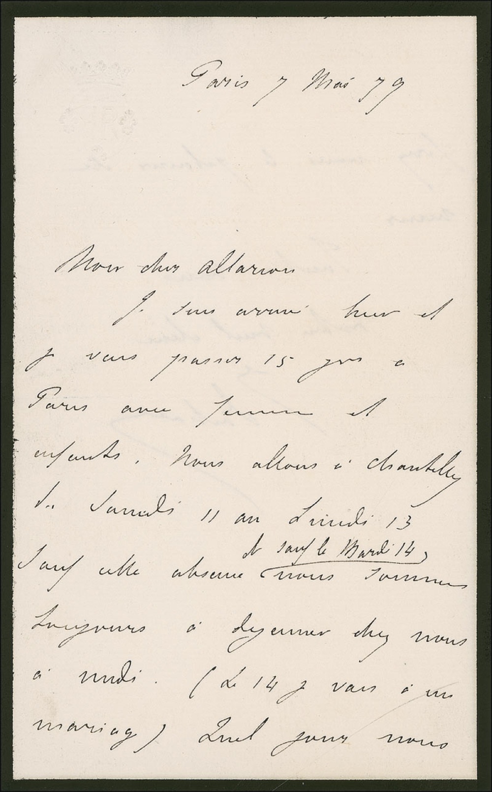 Grandson of King Louis-Philippe of France. He fought for the Union in the American Civil War, and then for France in the 1870 Franco-Prussian War. ALS in French, signed “R. of Orleans,” one page both sides, 4.5 x 7, black-bordered personal letterhead, May 7, 1879. In part: “I just arrived yesterday. I’ll be in Paris with my daughter and children. We’ll go to Chantilly…What day will you come and see us?” In fine condition. RRAuction COA.