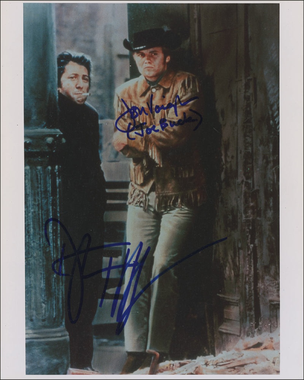 Color glossy 8 x 10 photo of Joe Buck and Ratso Rizzo standing on a street corner, signed in blue felt tip by Dustin Hoffman and Jon Voight, who has added his character name beneath his signature. In fine condition, with trivial surface scuffing. Pre-certified PSA/DNA and RRAuction COA.