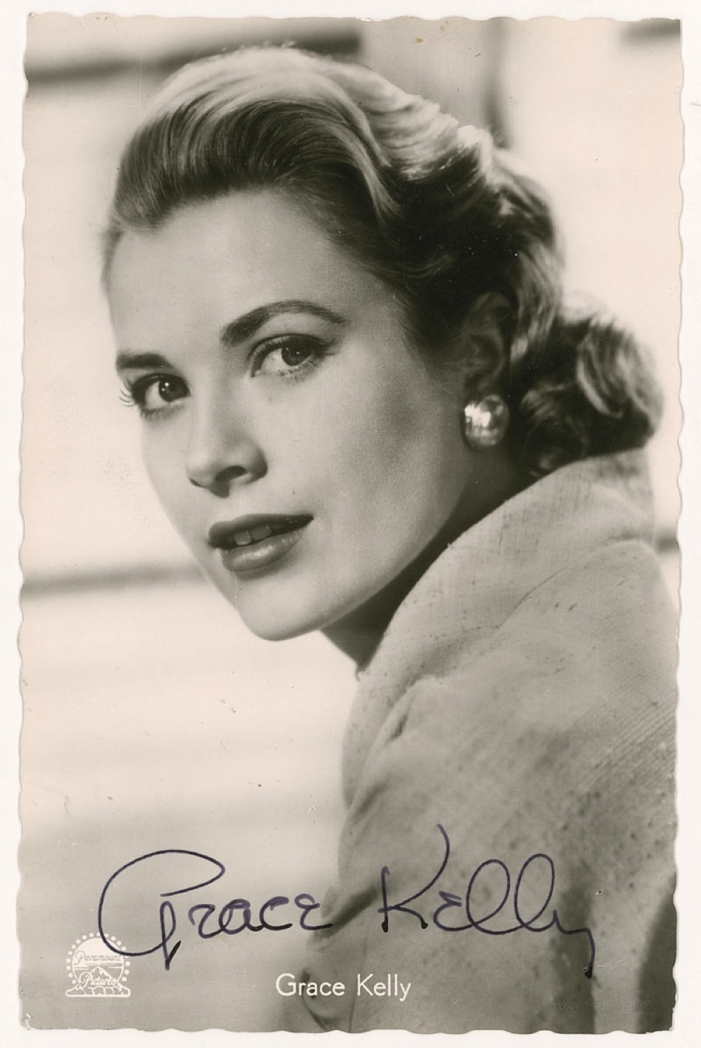 Vintage glossy 3.5 x 5.5 German postcard photo from her role in Rear Window, signed in fountain pen, “Grace Kelly.” In fine condition, with light creases touching her lips and hair. Pre-certified PSA/DNA and RRAuction COA.