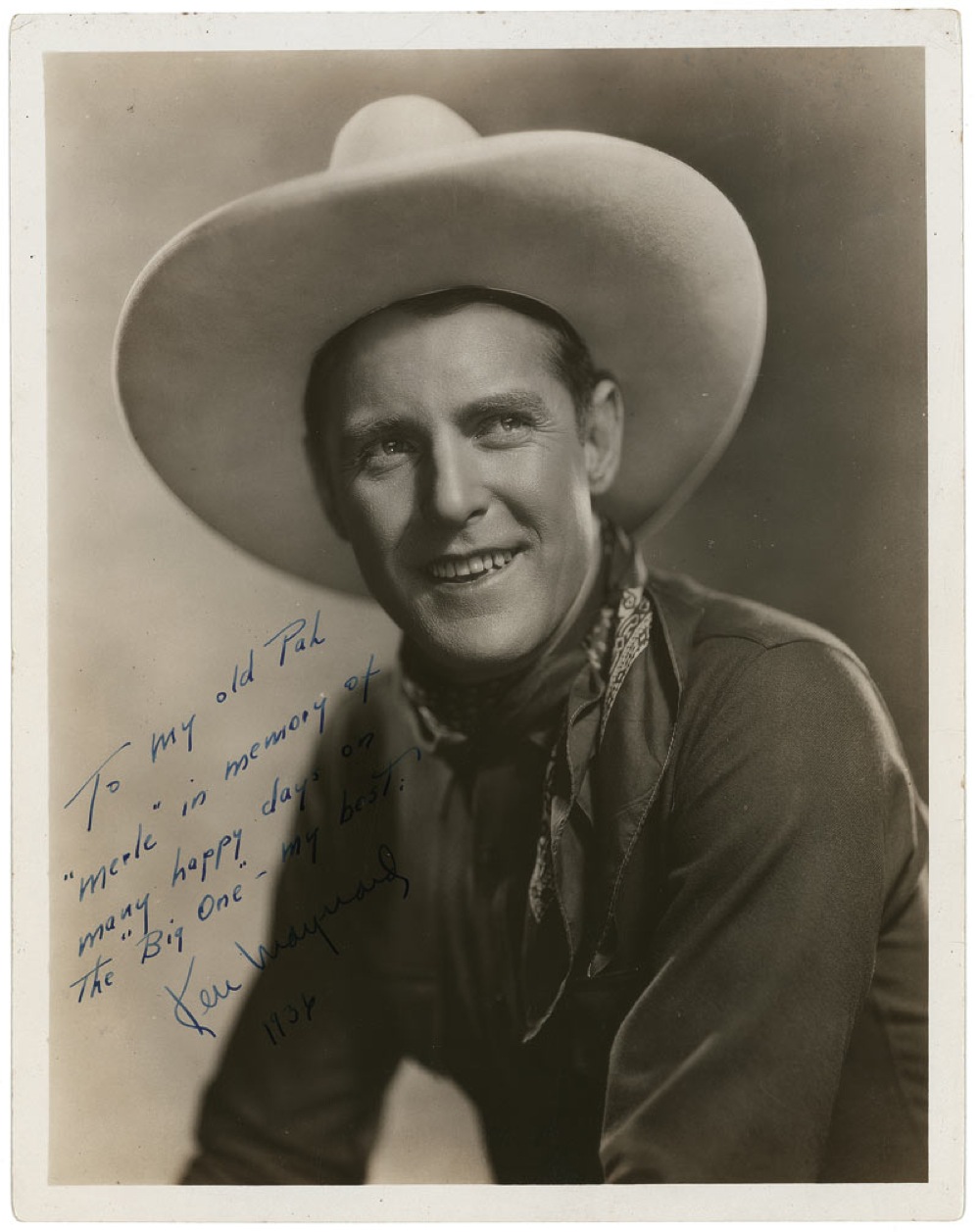 Vintage glossy 8 x 10 photo, signed and inscribed in fountain pen to longtime Ringling Bros. band director Merle Evans, “To my old pal ‘Merle’ in many of many happy days on the ‘Big One’—my best, Ken Maynard 1936”; and a vintage matte-finish 8 x 10 photo, signed in fountain pen. In very good condition, with tack holes and edge tears to second photo. RRAuction COA.