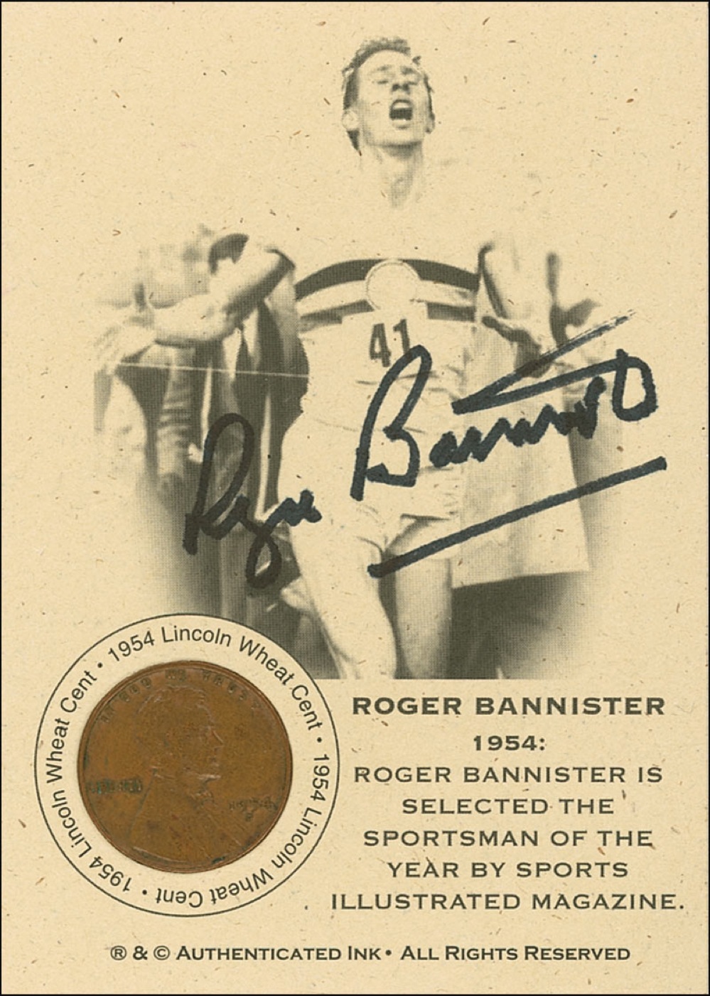 Souvenir 2.5 x 3.5 trading card picturing Bannister breaking the tape at the conclusion of the four-minute mile, displayed with a 1954 “wheat penny” and signed across the front of the image in black felt tip. In fine condition. Pre-certified Steve Grad/PSA/DNA and RRAuction COA.