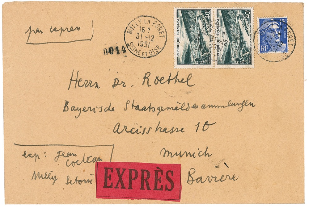 Versatile French poet, playwright, film director, and artist (1889–1963); among his best-known works are the novel Les Enfants Terrible and the film La Belle et la Bête. Hand-addressed and signed mailing envelope, 7.5 x 5, postmarked December 31, 1951, addressed by Cocteau to “Herrn Dr. Roethel,” in Munich, and signed in the lower left corner, “Jean Cocteau,” as part of his return address. In fine condition, with an “exprès” label affixed directly below signature, and some light wrinkling. Pre-certified PSA/DNA and RRAuction COA.