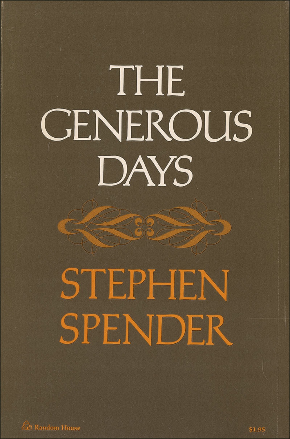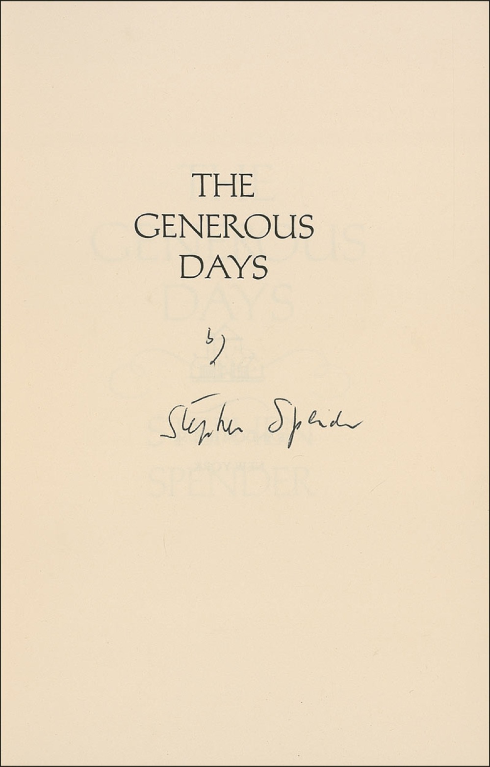 Signed book: The Generous Days. First American Edition. NY: Random House, 1971. Softcover, 5.5 x 8.25, 44 pages. Signed in black ballpoint on the title page, “by Stephen Spender,” beneath the printed title. In fine condition, with few surface marks to the back cover. RRAuction COA.