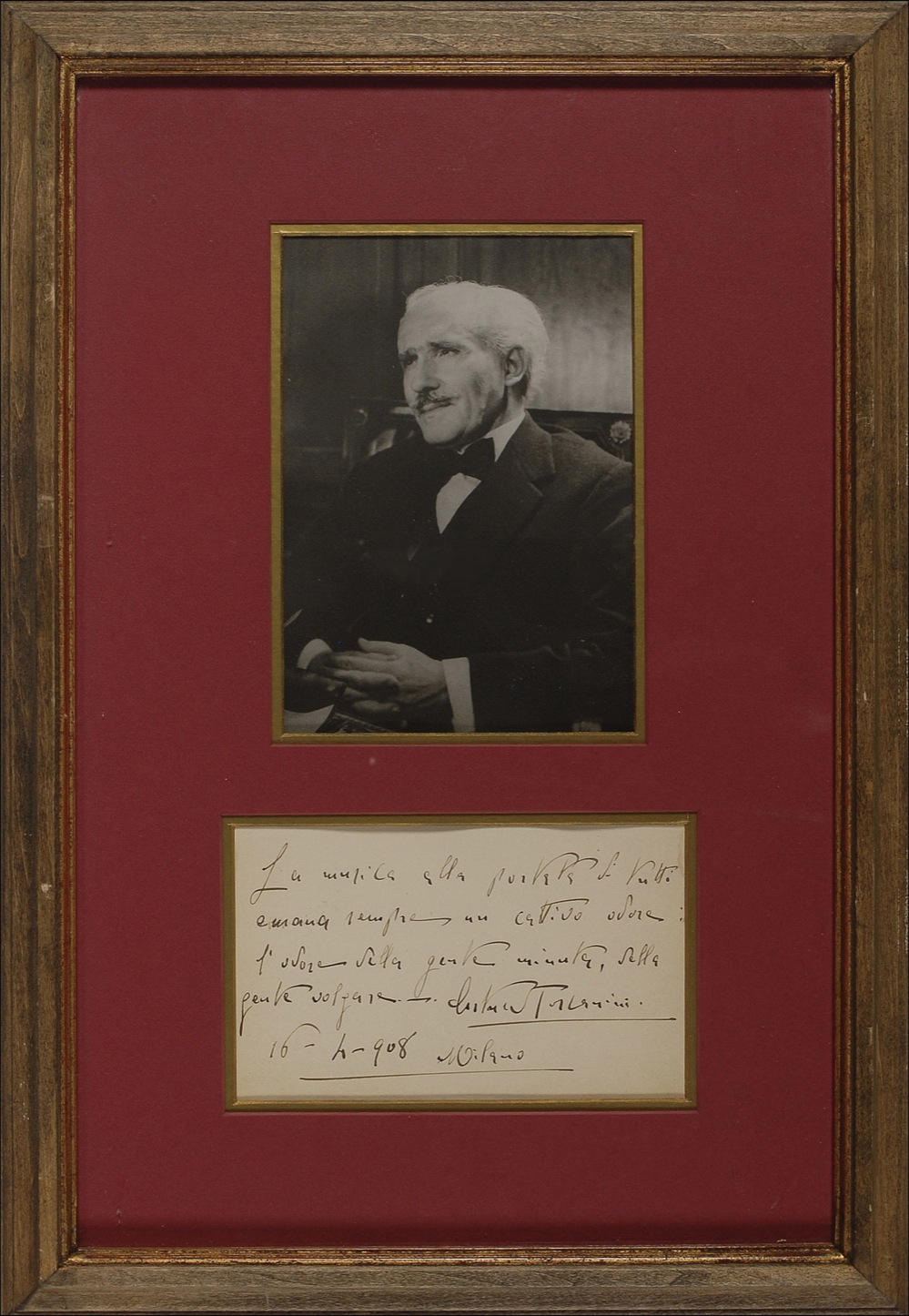 AQS, in Italian, signed “Arturo Toscanini 16-4-1908 Milano” on an off-white 6 x 3.5 card. Toscanini paraphrases a quotation from Nietzsche. In full, translated: “Music for everyone (popular music) emits always a bad odor; the odor of tiny people, of vulgar people.” Double matted and framed to an overall size of 12.5 x 18. In fine condition. Pre-certified PSA/DNA and RRAuction COA.