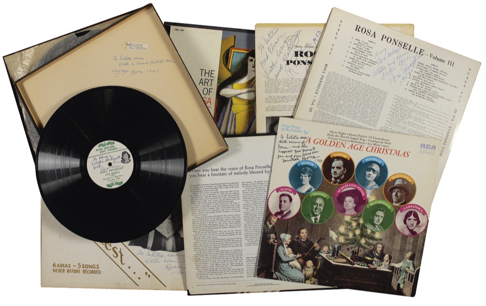 Singer (1897–1981) who possessed one of the most beautiful voices of the century. Admired for “opulence of tone, evenness of scale, breadth of range, perfection of technique and communicative warmth,” all attributes convincingly documented on her recordings. Nine items: ink inscriptions and signatures (first name only) on different albums,signed on the cover, label, or inside box covers. In overall very good condition. Records included. Accompanied by three unsigned albums. RRAuction COA.