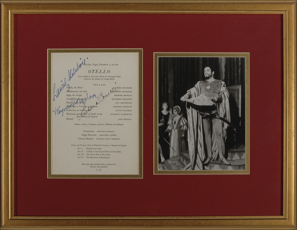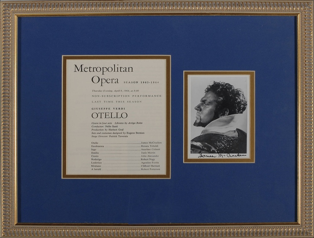Three items: 5.75 x 8 page from a San Francisco Opera program for Otello, signed in ink by Lauritz Melchior, Richard Bonelli, and Raymond Marlowe, matted and framed to an overall size of 20 x 15.5; a 3.25 x 4.75 photo signed in black felt tip by James McCracken, matted and framed to an overall size of 17 x 14.25; and an 8 x 10 glossy photo signed and inscribed in blue fountain pen by Bidu Sayao, framed to an overall size of 9.25 x 11. In overall fine condition. RRAuction COA.