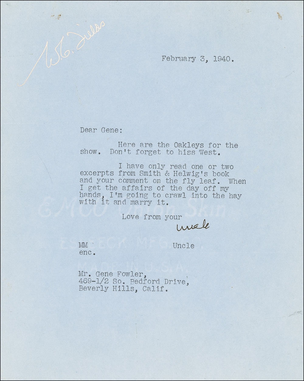 TLS signed “Uncle,” one page, 8 x 10, personal letterhead, February 3, 1940. Short letter to his friend, author Gene Fowler. In full: “Here are the Oakleys for the show. Don’t forget to hiss West. I have only read one or two excerpts from Smith & Helwig’s book and your comment on the fly leaf. When I get the affairs of the day off my hands, I’m going to crawl into the hay with it and marry it.” In fine condition, with light creasing and soiling. Pre-certified PSA/DNA and RRAuction COA.