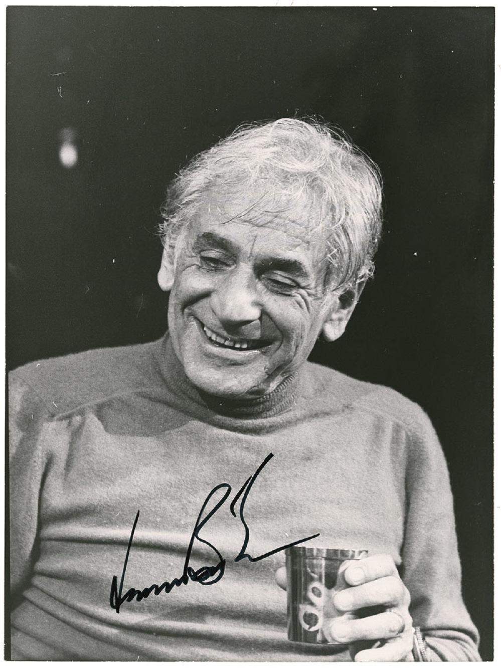 Glossy 7 x 9.5 photo of Bernstein enjoying a beverage, signed in black felt tip. In very good condition, with scattered creasing and surface marks and lightly trimmed edges. Pre-certified PSA/DNA and RRAuction COA.