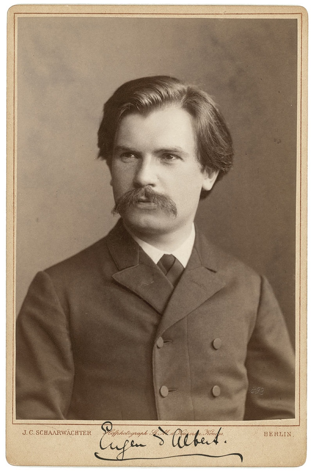 Scottish-born German composer (1864–1932) of operas and much orchestral and piano music. Original vintage 4.25 x 6.5 cabinet photo by J. C. Schaarwachter of Berlin, of d’Albert in a double-breasted jacket, signed in the lower border in black ink. In fine condition, with a few scattered light surface marks and a stamped date of 1892 to lower right of image. RRAuction COA.