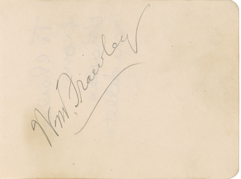 American actor (1887-1966) most well-known for his role as landlord Fred Mertz in I Love Lucy. Vintage pencil signature, “Wm. Frawley,” on an off-white 6 x 4.5 album page. In fine condition, with a bit of scattered light toning, and show-through from a Charles Middleton signature and inscription on reverse. Pre-certified PSA/DNA and RRAuction COA.