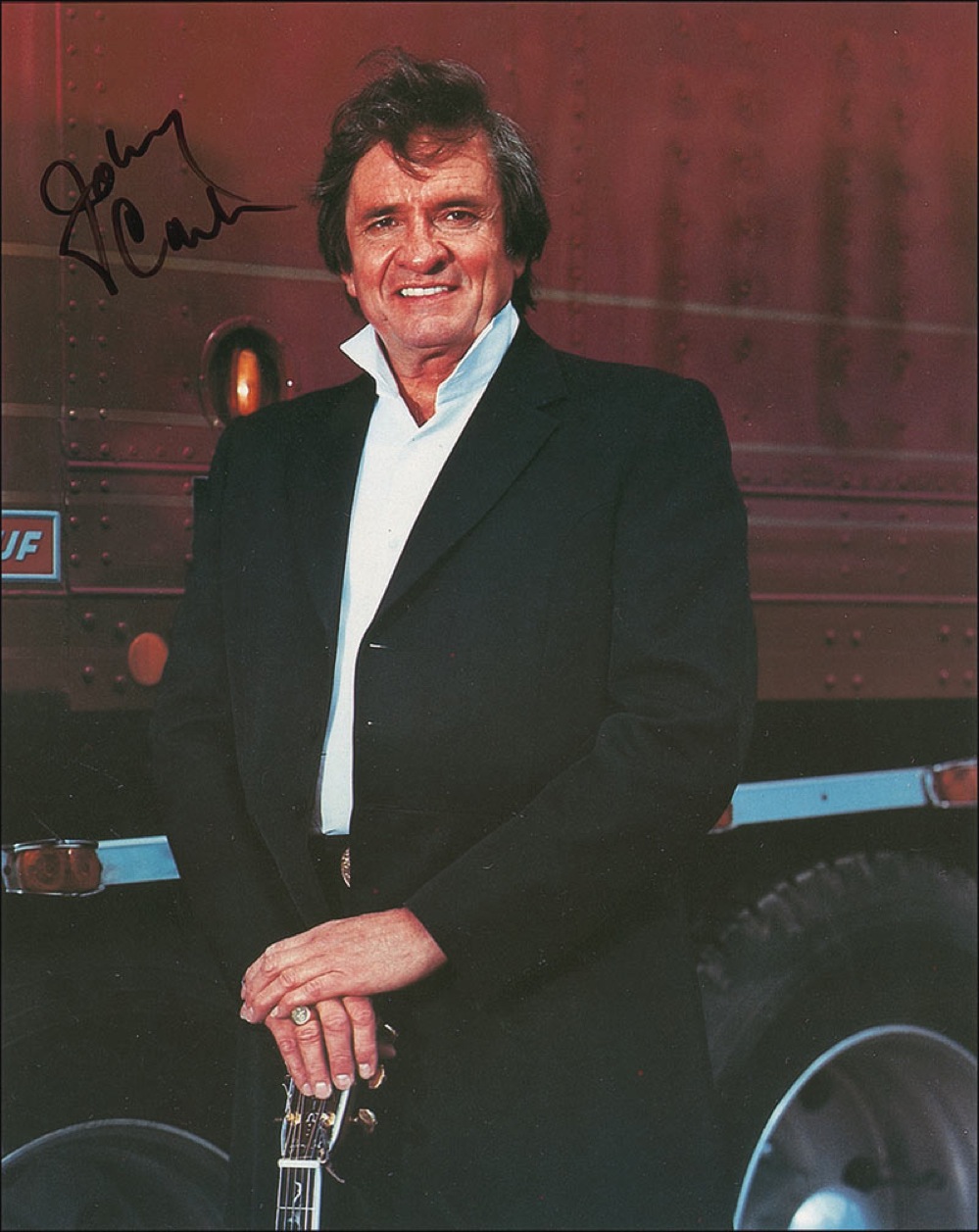 Two items. Color cardstock 8 x 10 photo of the Man in Black, signed in black felt tip; and a color cardstock 8 x 10 photo of June Carter Cash, also signed in black felt tip. In fine condition. RRAuction COA.