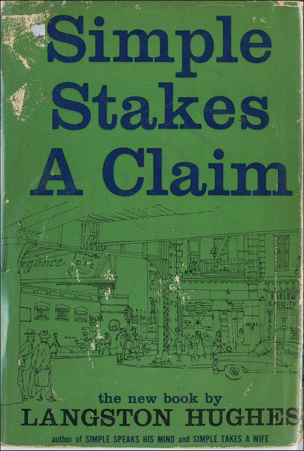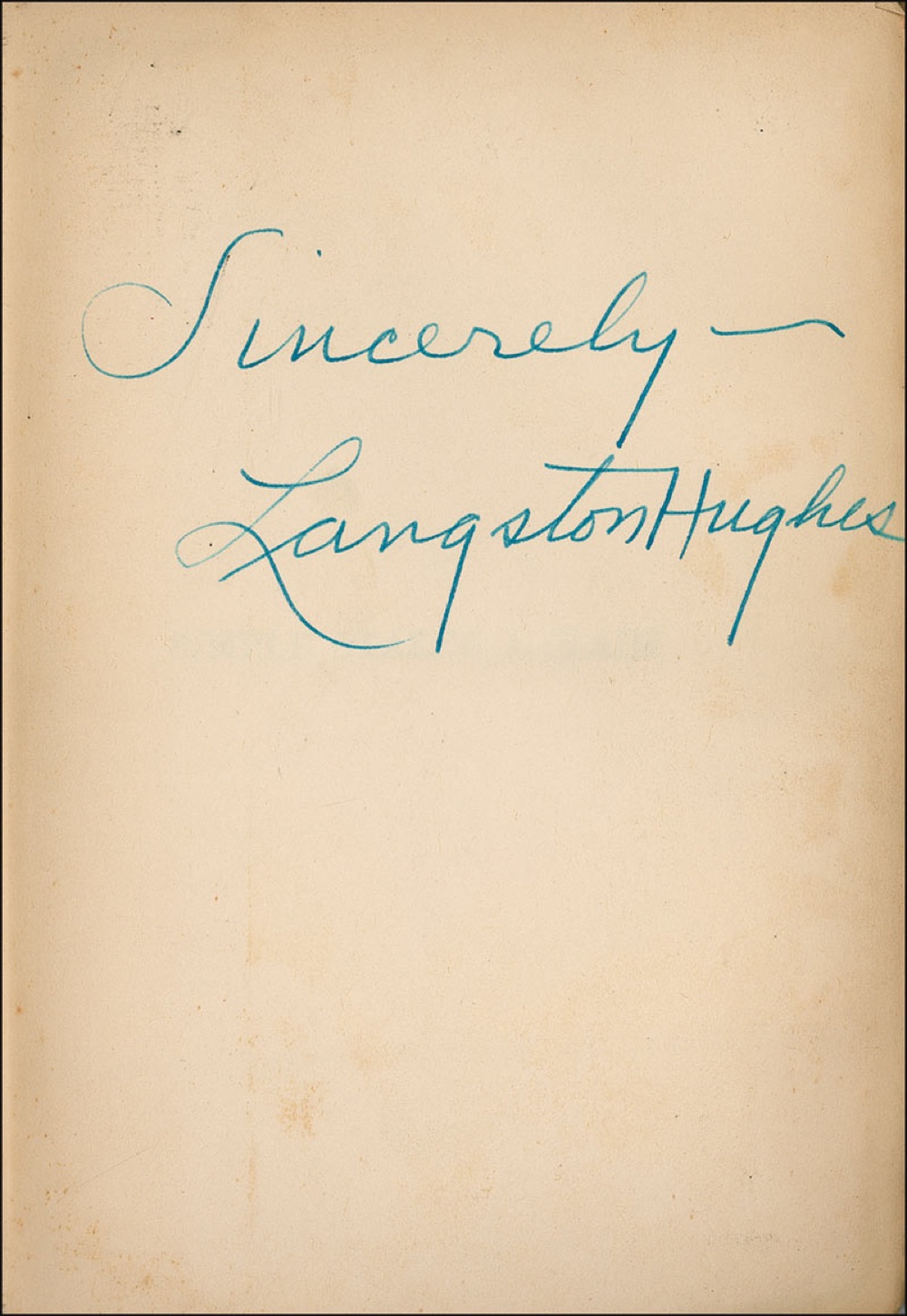 American writer (1902–1967), one of the key figures of the Harlem Renaissance, best known for such works as Weary Blues and The Ways of White Folks. Signed book: Simple Stakes A Claim. Later printing. NY: Rinehard & Company, Inc., 1957. Hardcover with dustjacket, 5.5 x 7.75, 191 pages. Signed in blue fountain pen, “Sincerely–Langston Hughes,” on the first free-end page. In very good condition, with heavy edge toning and wrinkling to the pages from exposure to moisture, sunning to the spine, and mild to moderate wear, soiling, and chipping to the dustjacket. RRAuction COA.