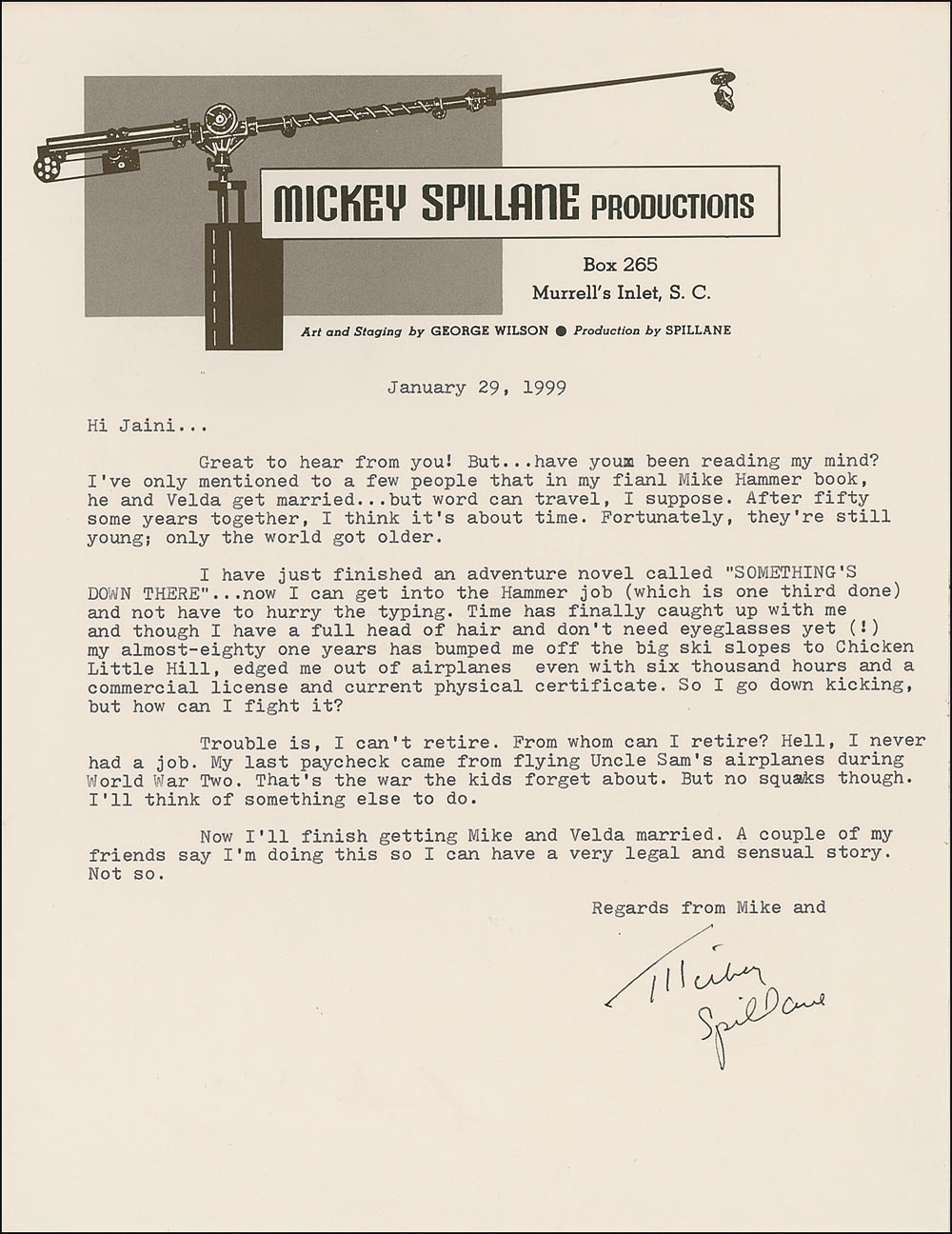 TLS, one page, 8.5 x 11, Mickey Spillane Productions letterhead, January 29, 1999. Letter to Jaini. In part: “Great to hear from you! But…have you been reading my mind? I’ve only mentioned to a few people that in my fianl [sic] Mike Hammer book, he and Velda get married…After fifty some years together, I think it’s about time. Fortunately, they’re still young; only the world got older. I have just finished an adventure novel called ‘Something’s Down There’…now I can get into the Hammer job (which is one third done) and not to have to hurry typing. Time has finally caught up with me and though I have a full head of hair and don’t need eyeglasses yet (!) my almost-eighty one years has bumped me off the big ski slopes to Chicken Little Hill, edged me out of airplanes even with six thousand hours and a commercial license and current physical certificate. So I go down kicking, but how can I fight it? Trouble is I can’t retire…Now I’ll finish getting Mike and Velda married.” In fine condition, with a few light creases. RRAuction COA.