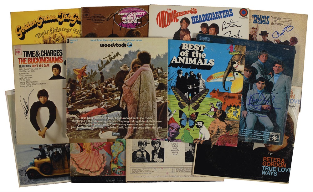 Twelve albums, each signed in blue, black, or gold felt tip on the cover by its respective musician(s). Signers are: one member of the Animals (Best of the Animals), Peter Asher and Gordon Waller (True Love Ways), Nick Fortuna and Carl Giammarese (Time and Charges), Rob Grill (Golden Grass, The Grassroots), Tommy James (The Best of Tommy James and the Shondells), Mike Love (Surfin’ Safari), Roger McGuinn (Younger Than Yesterday), one member of Mountain (Nantucket Sleighride), Gary Puckett (Gary Puckett and the Union Gap), John Sebastian (Woodstock), Chad Stuart and Jeremy Clyde (Before and After), Peter Tork (Headquarters). Several of the albums are included. In overall very good to fine condition. RRAuction COA.