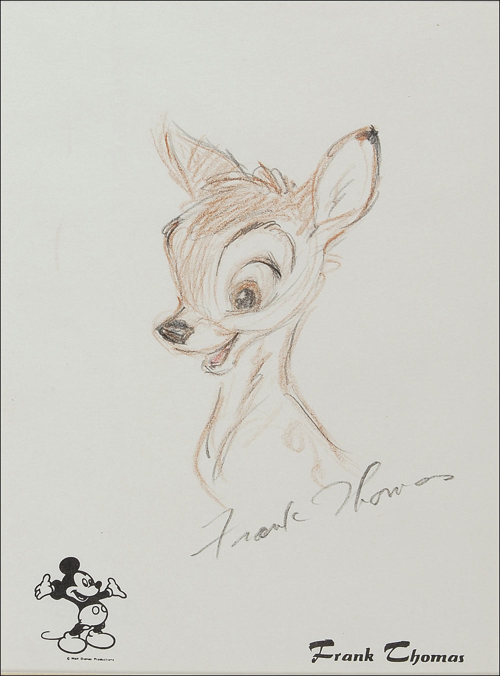 Original signed colored pencil sketch of Bambi on an off-white 5.5 x 7.5 sheet of his personal stationery. Matted to an overall size of 8 x 10. In fine condition. RRAuction COA.