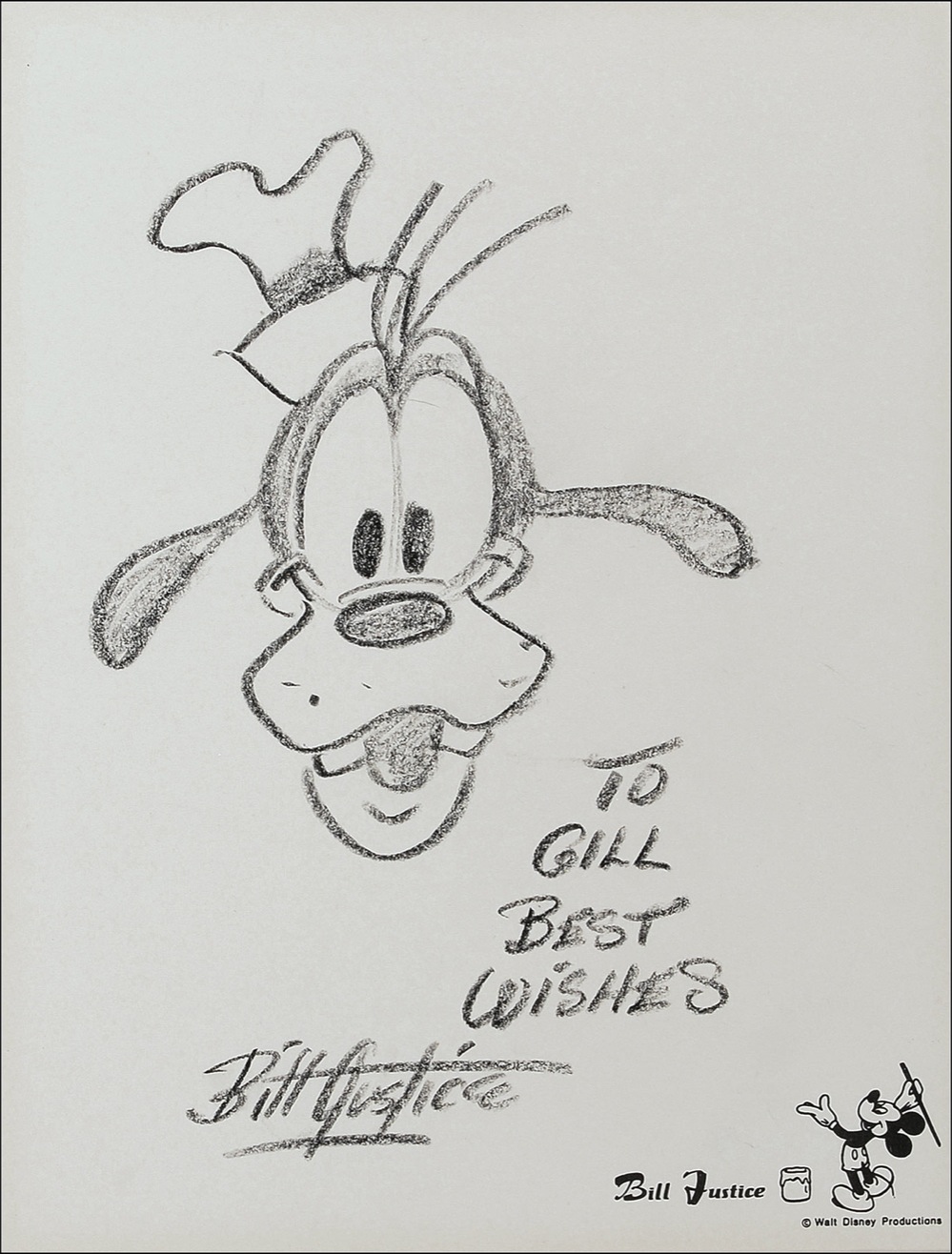 Original signed and inscribed crayon sketch of Goofy on an off-white 8.5 x 11 sheet of his personal stationery, signed and inscribed “To Gill, Best wishes, Bill Justice.” Matted to an overall size of 11 x 14. In fine condition. RRAuction COA.