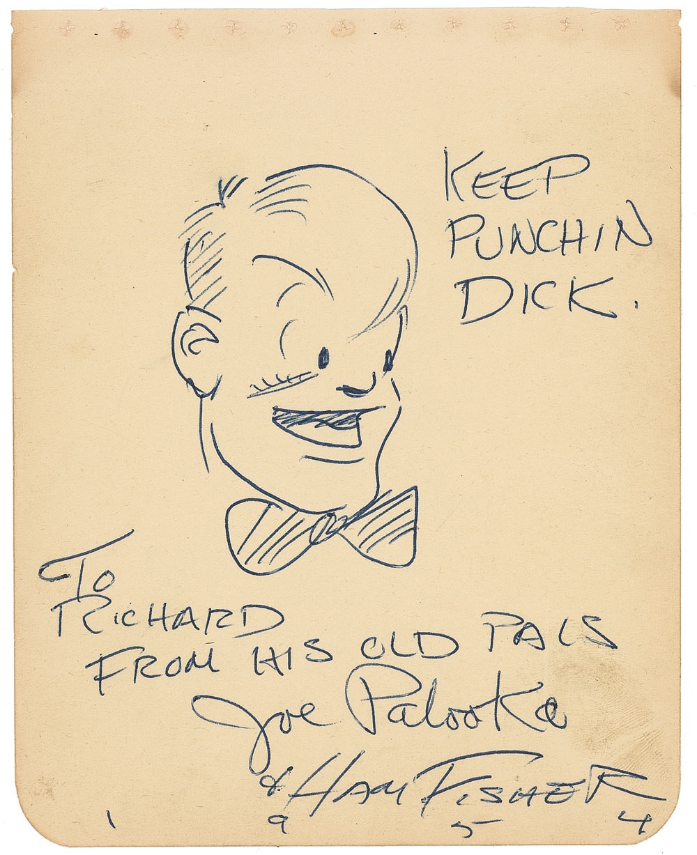 Original vintage signed and inscribed ballpoint sketch of Joe Palooka saying “Keep punchin’ Dick,” on an off-white 4.5 x 5.5 album page, signed and inscribed, “To Richard from his old pals Joe Palooka & Ham Fisher 1954.” In fine condition, with light horizontal crease along top, and a bit of scattered light soiling. RRAuction COA.