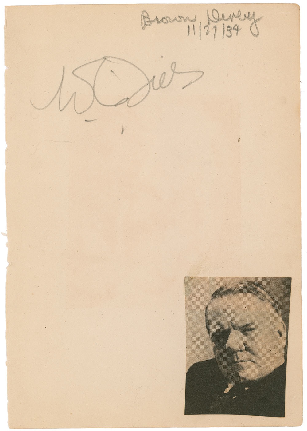 Vintage pencil signature, “W. C. Fields,” on an off-white 4.75 x 7 album page, with a collector’s notation at the top reading “Brown Derby 11/27/34,” and a small clipped photo affixed to lower right corner. In fine condition, with some scattered light toning, and a few stray pencil marks. Pre-certified PSA/DNA and RRAuction COA.