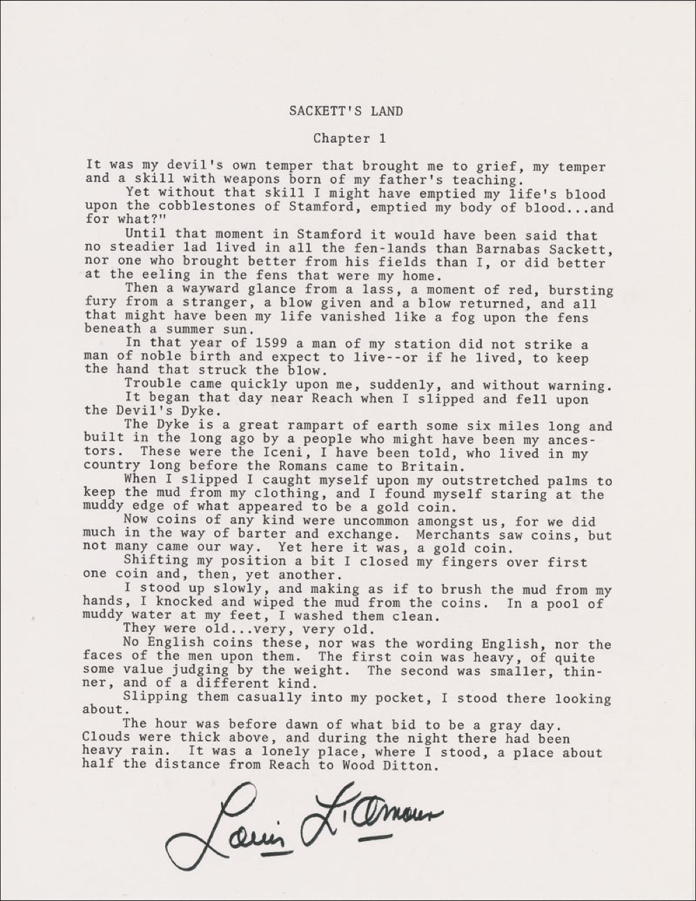 Souvenir typescript, signed at the bottom in black felt tip, “Louis L’Amour,” one page 8.5 x 11. The opening of Chapter One of Sackett’s land beginning: “It was my devil’s own temper that brought me to grief, my temper and a skill with weapons born of my father’s teaching. Yet without that skill I might have emptied my life’s blood upon the cobblestones of Stamford, emptied my body of blood…and for what?” In fine condition. RRAuction COA.