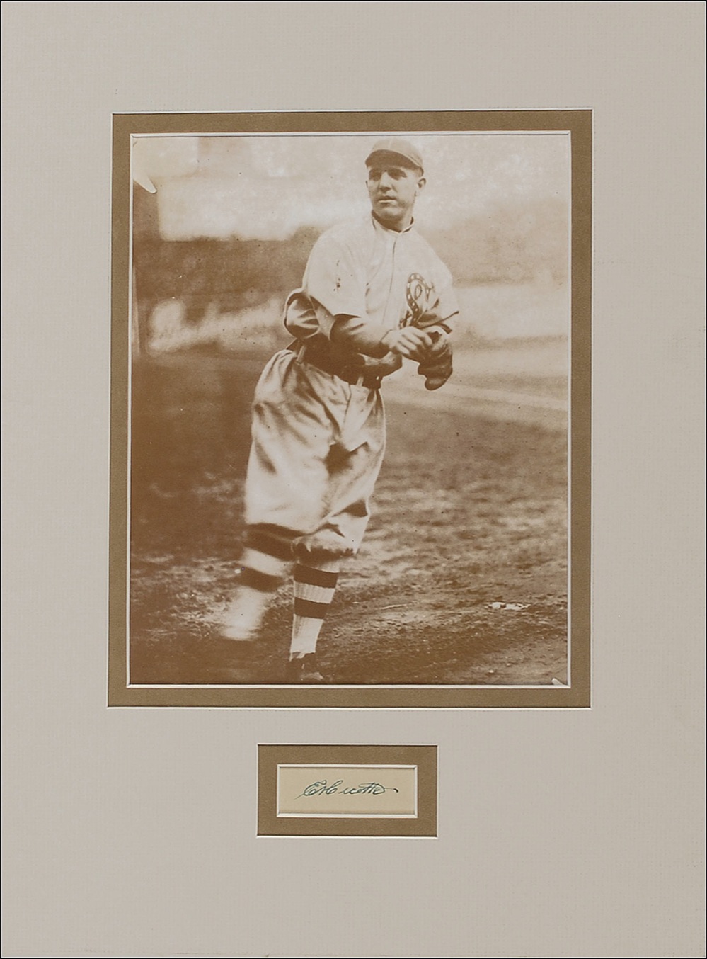 Baseball player remembered as a member of the scandalous 1919 Chicago White Sox team. Cicotte was the pitcher who threw the first pitch of the World Series, intentionally hitting the batter to signal the gamblers that the “fix” was on. Vintage fountain pen signature, “Ed Cicotte,” on an off-white slip. Double matted with a portrait of Cicotte in his uniform, to an overall size of 12 x 16. In fine condition. Pre-certified Steve Grad/PSA/DNA and RRAuction COA.