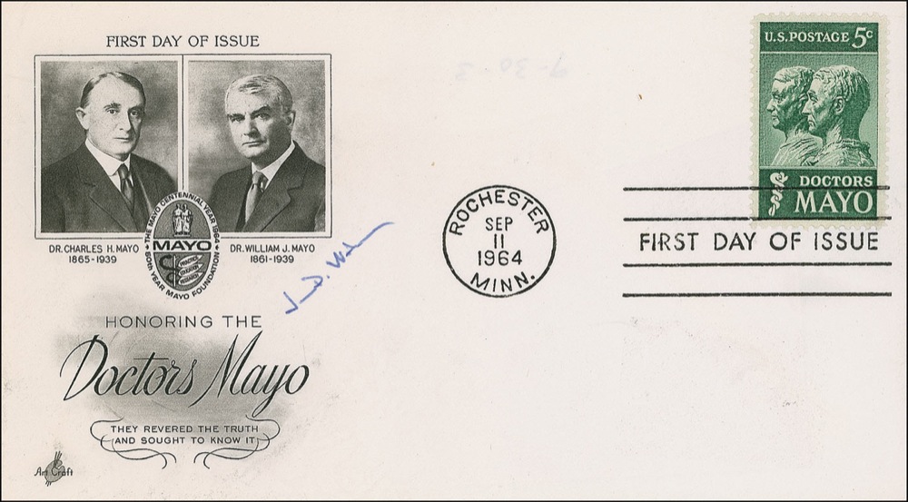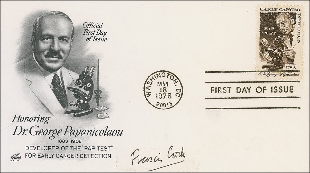 Along with Maurice Wilkins, James D. Watson (born 1928) and Francis Crick (1916–2004) shared the 1962 Nobel Prize in Medicine for discovering the function and structure of DNA, providing the prime impetus for further research in the emerging fields of molecular genetics and biochemistry. Two signed FDCs: one with a cachet honoring the Mayo Brothers, signed in blue ballpoint, “J. D. Watson”; and one with a cachet honoring Dr. George Papanicolaou, signed in black ink by Crick. In fine condition, with two paperclip impressions to bottom of Crick’s cover. RRAuction COA.