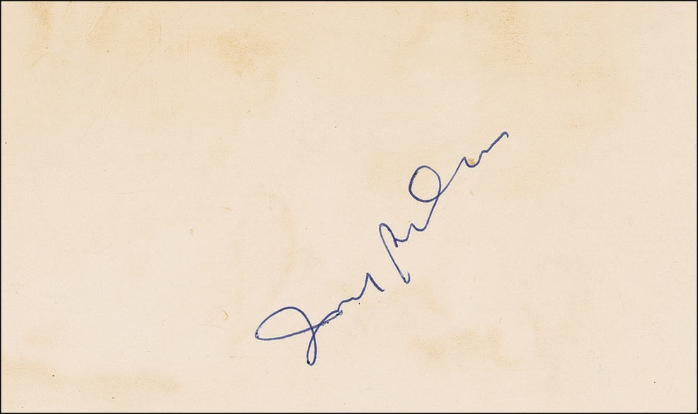 Ballpoint signature, “Irving Berlin,” on an off-white 5 x 3 card. Scattered light toning, otherwise fine condition. RRAuction COA.