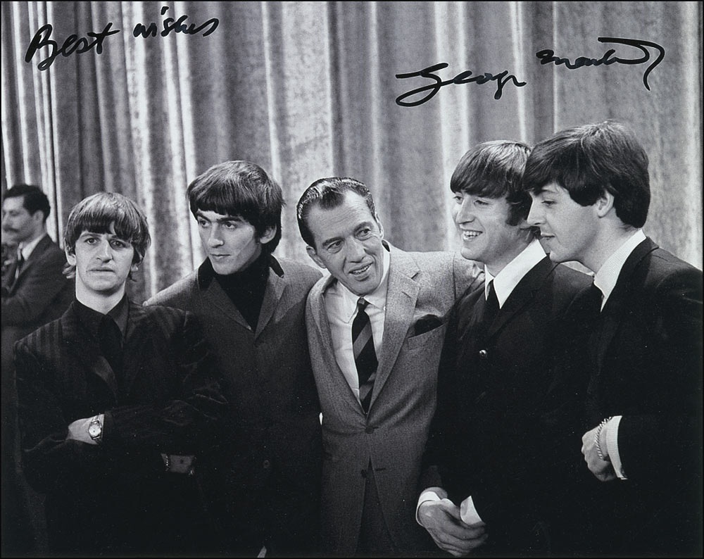 Glossy 10 x 8 photo of the Beatles posing with Ed Sullivan, signed in black felt tip, “Best wishes, George Martin.” In very fine condition. Pre-certified Roger Epperson/REAL and RRAuction COA.