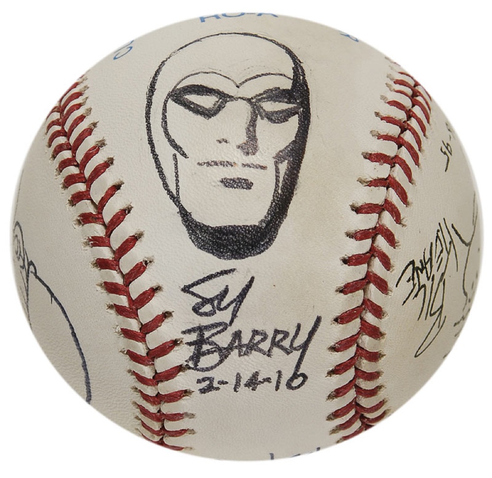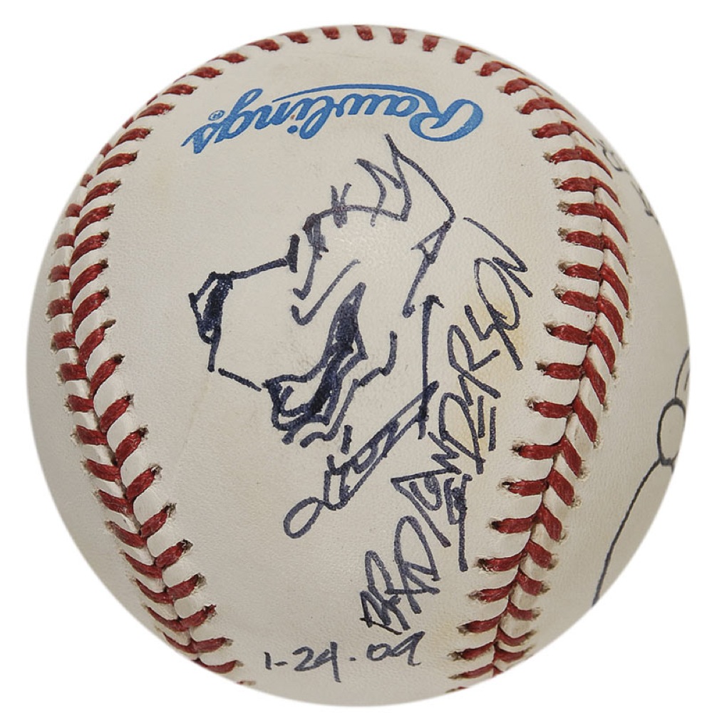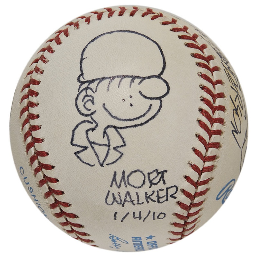 Official Rawlings American League baseball signed in ink on the side panels by four different cartoonists, each adding a sketch of one of their characters. Signers are: Sy Burry (The Phantom), Bil Keane (Jeffy from Family Circus), Mort Walker (Beetle Bailey), and Brad Anderson (Marmaduke). In fine condition, with some scattered light toning. RRAuction COA.