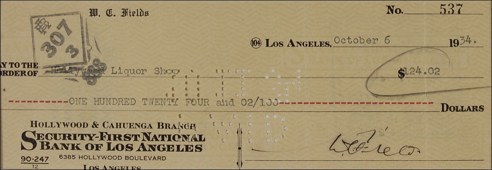 Personal check, 8 x 3, filled out in type and signed by Fields, payable to Hollywood Liquor Store for $124.02, October 6, 1934. Matted with a photo of Fields, to an overall size of 11 x 14. Two vertical folds, expected cancellation holes and stamps, pencil mark to body, and a light brush to signature, otherwise fine condition. Pre-certified PSA/DNA and RRAuction COA.
