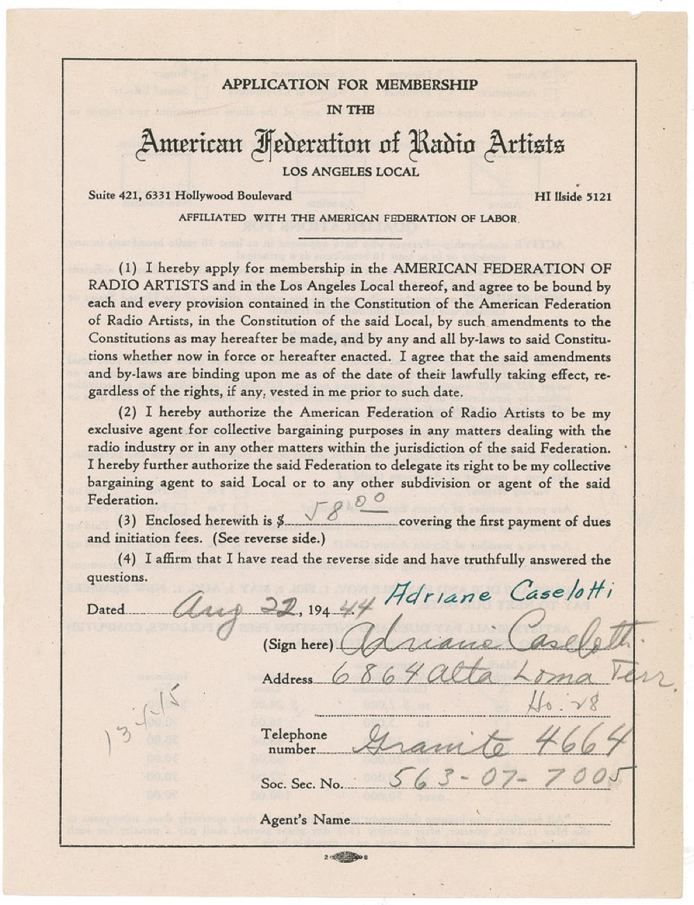 DS, one page both sides, 6.5 x 8.5, August 22, 1944. Application for membership to the American Federation of Radio Artists, filled out and signed in pencil by Caselotti, who lists herself as an active actor and singer who earned under $25,000. In fine condition, with green ink notation to front and a central vertical fold. RRAuction COA.