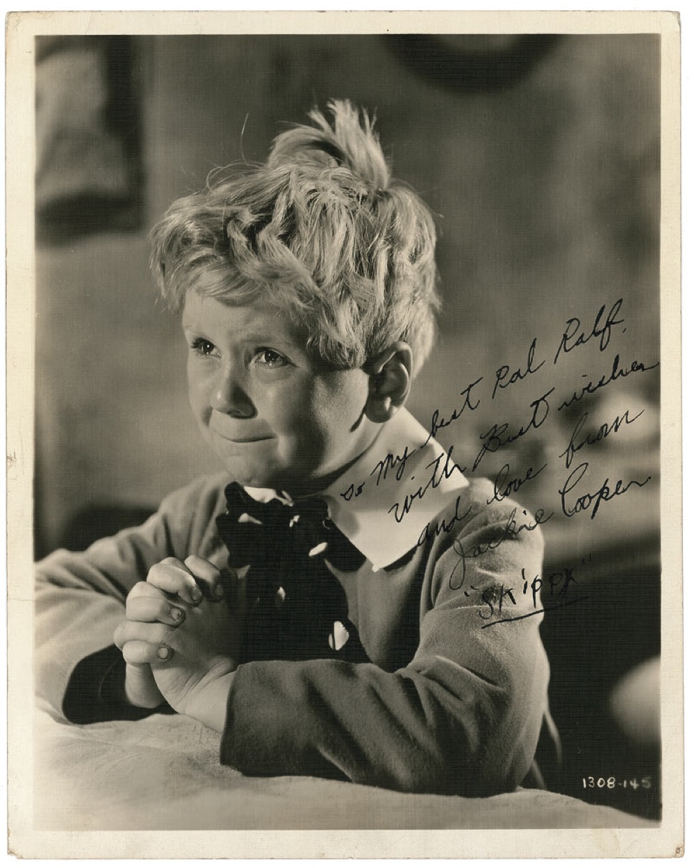 Vintage matte-finish 8 x 10 photo of Cooper as the tearful Skippy, signed and inscribed in fountain pen “To my best pal Ralf, with best wishes and love from Jackie Cooper ‘Skippy.’” In fine condition, with a few light edge and corner creases. Cooper was nominated for the Academy Award for Best Actor for Skippy—the youngest actor ever (at the age of 9) to be nominated for an Oscar as Best Actor. Pre-certified PSA/DNA and RRAuction COA.