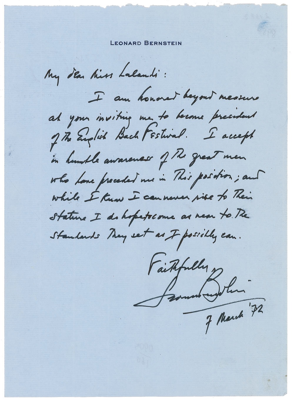 ALS, one page, 6.75 x 9.25, personal letterhead, March 7, 1972. Letter to Greek harpsichordist Lina Lalandi. In full: “I am honored beyond measure at your inviting me to become president of the English Bach Festival. I accept in humble awareness of the great men who have preceded me in this position; and while I know I can never rise to their stature I do hope to come as near to the standards they set as I possibly can.” In fine condition, with a bit of trivial soiling and a couple of minor creases. Accompanied by the original mailing envelope addressed by Bernstein, who has signed the reverse as part of his return address. Indeed Bernstein, as third president of this society, was in good company, having followed Albert Schweitzer and Igor Stravinsky. Pre-certified PSA/DNA and RRAuction COA.