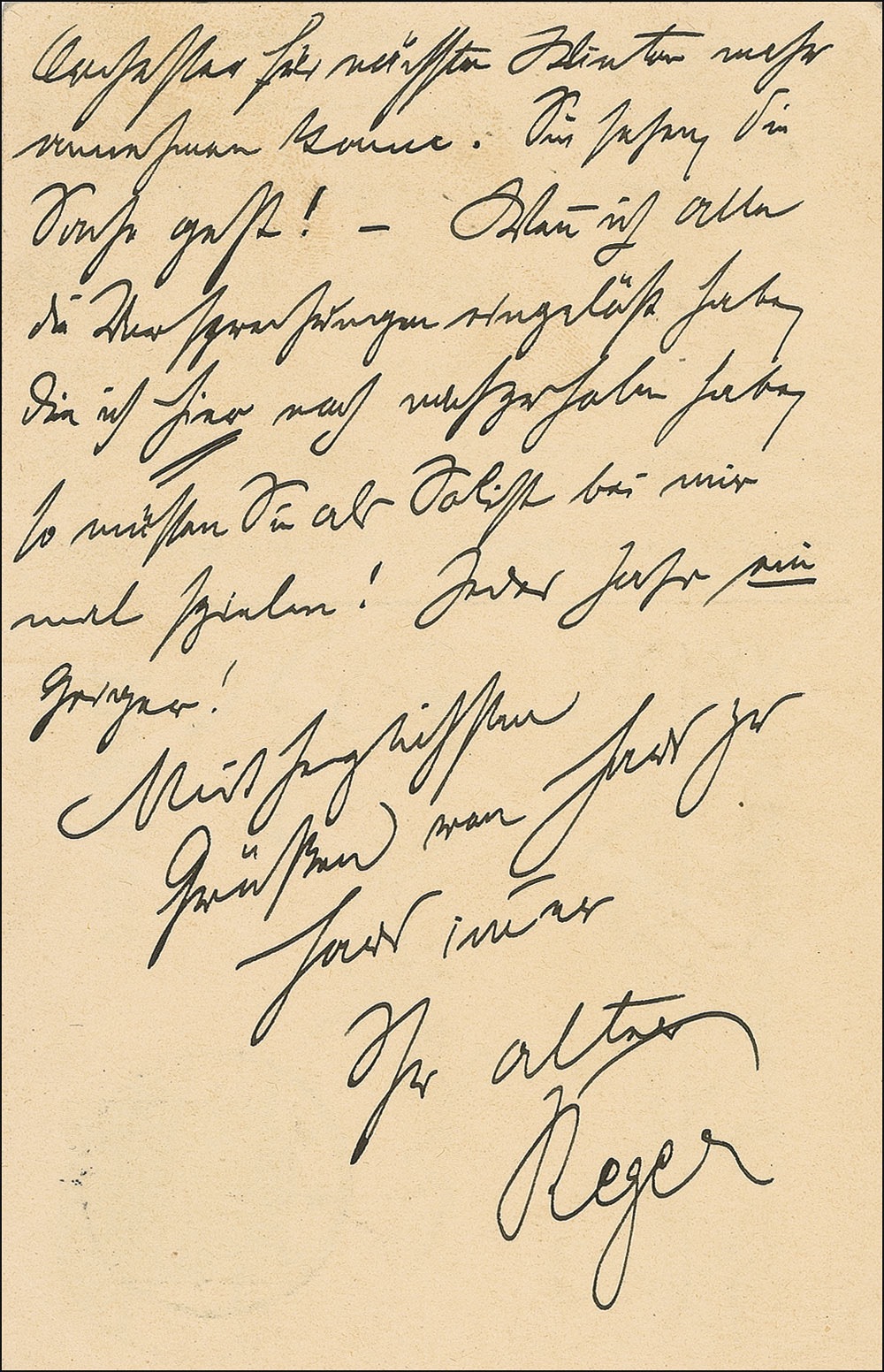 Prolific German composer (1873–1916) best known for his densely contrapuntal, Bach-inspired keyboard works. ALS in German, signed “Reger,” one both sides of a 3.5 x 5.5 postcard, no date, but postmarked April 10, 1912. Letter to Professor Waldemar Meyer. In part: “For next winter I have already so many engagements for the Meininger Hofkapelle that I cannot accept any other engagements for the coming winter. As you can see, things are going well!—once I have fulfilled all the promises that I have to take care of here, you will have to be a soloist for me! Every year one violinist!” In fine condition, with light show-through from postmark. RRAuction COA.