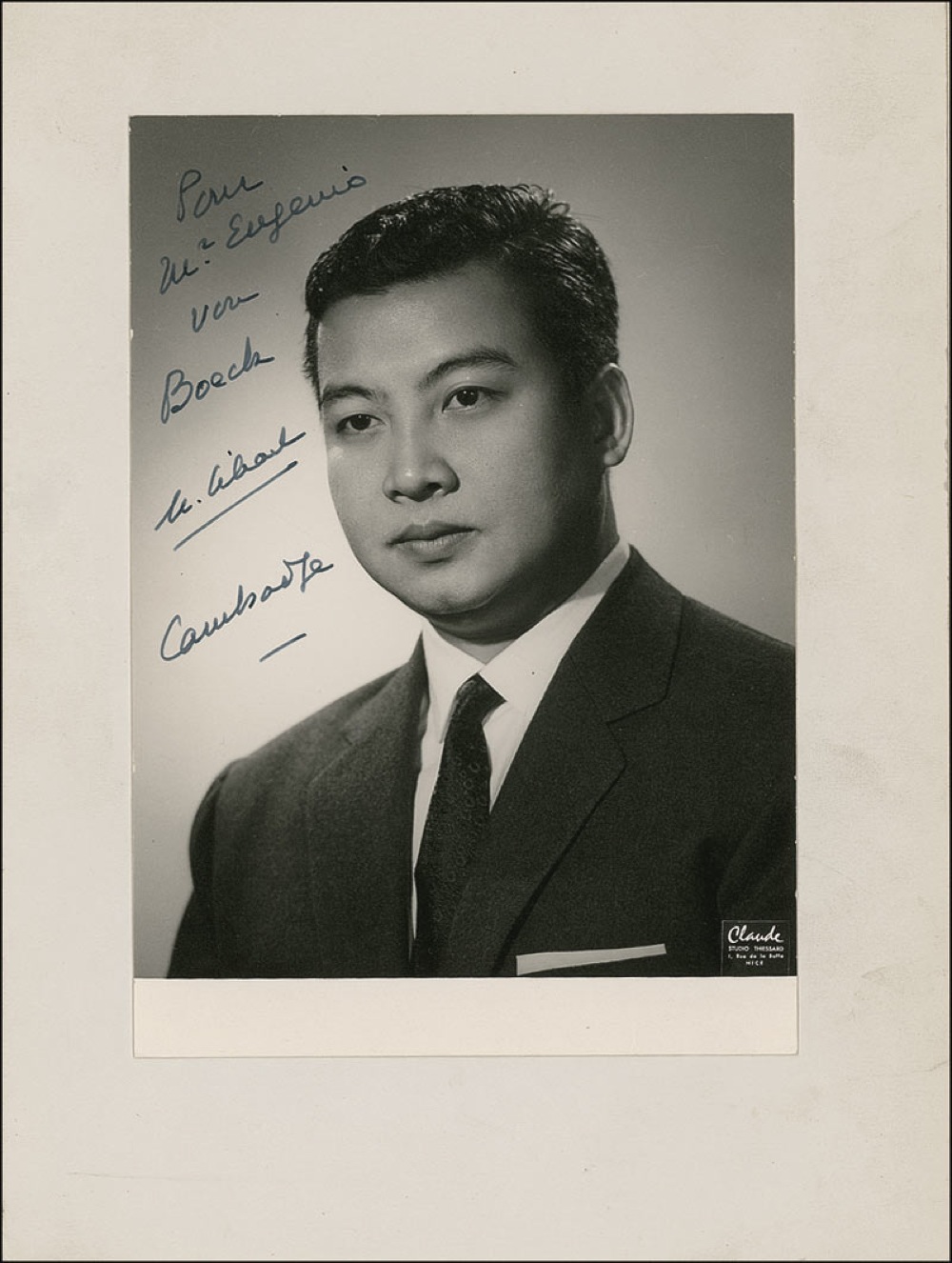 Leader of Cambodia (born 1922) under various titles, including King, from 1941 until his abdication in 2004. Vintage matte-finish 5 x 7 photo, affixed to its original 7.25 x 9.5 mount, signed and inscribed in black ink. In fine condition. Accompanied by a 1967 transmittal letter signed by Phuong Margain, Director of Cabinet of the Head of State. RRAuction COA.