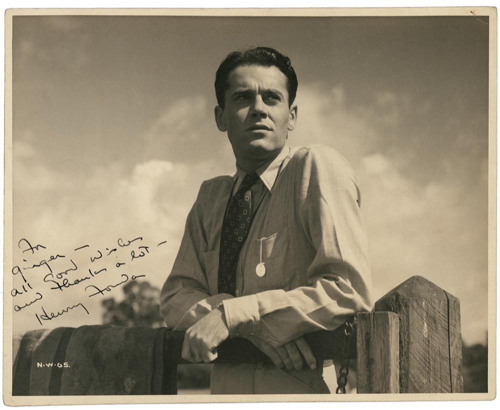 Vintage sepia matte-finish 9.75 x 7.75 cardstock photo a young Fonda, signed and inscribed in black fountain pen, “For Ginger—all good wishes and thanks a lot—Henry Fonda.” In fine condition, with tiny corner bends, faint soiling, and trimmed edges. Pre-certified PSA/DNA and RRAuction COA.