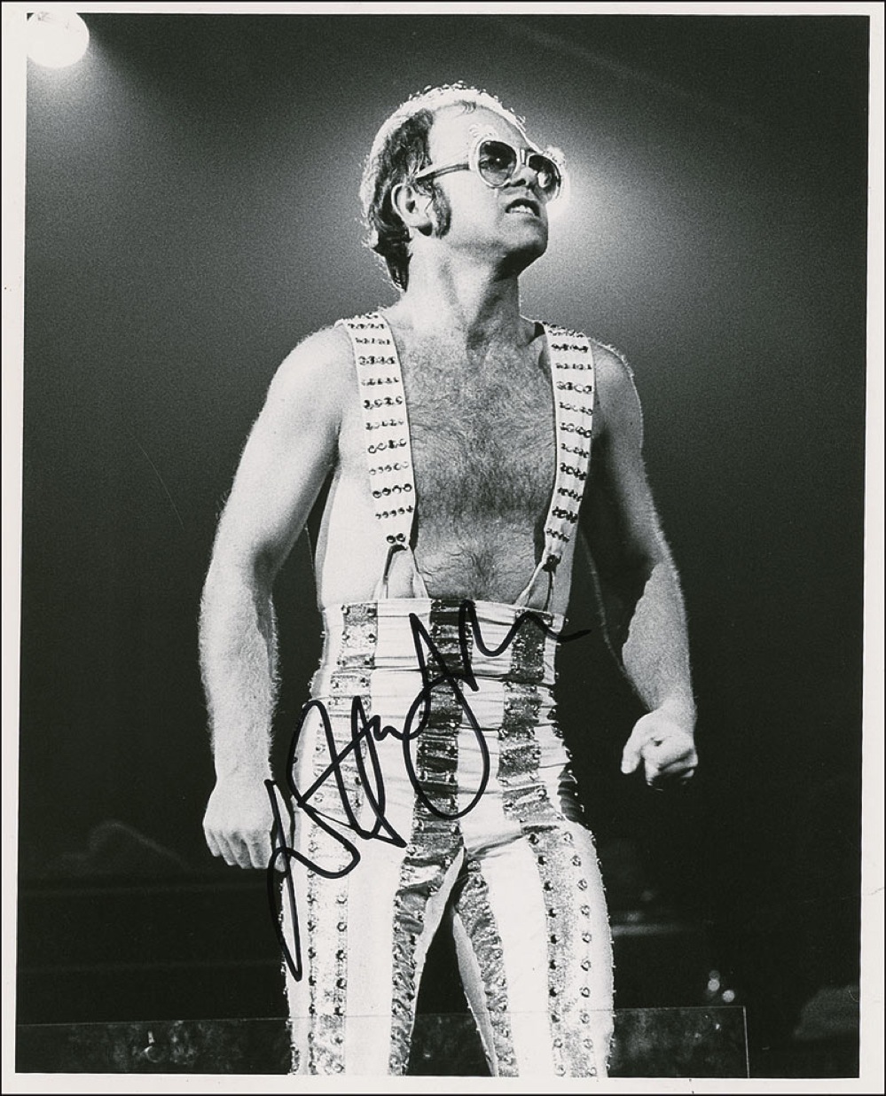 Satin-finish 8 x 10 photo of a shirtless, suspender-wearing John in concert, signed in-person in black felt tip. In fine condition, with a few scattered surface creases. Signature was obtained in Stockholm, Sweden in 1995 after Elton John received the Polar Music Prize. Pre-certified Roger Epperson/REAL and RRAuction COA.