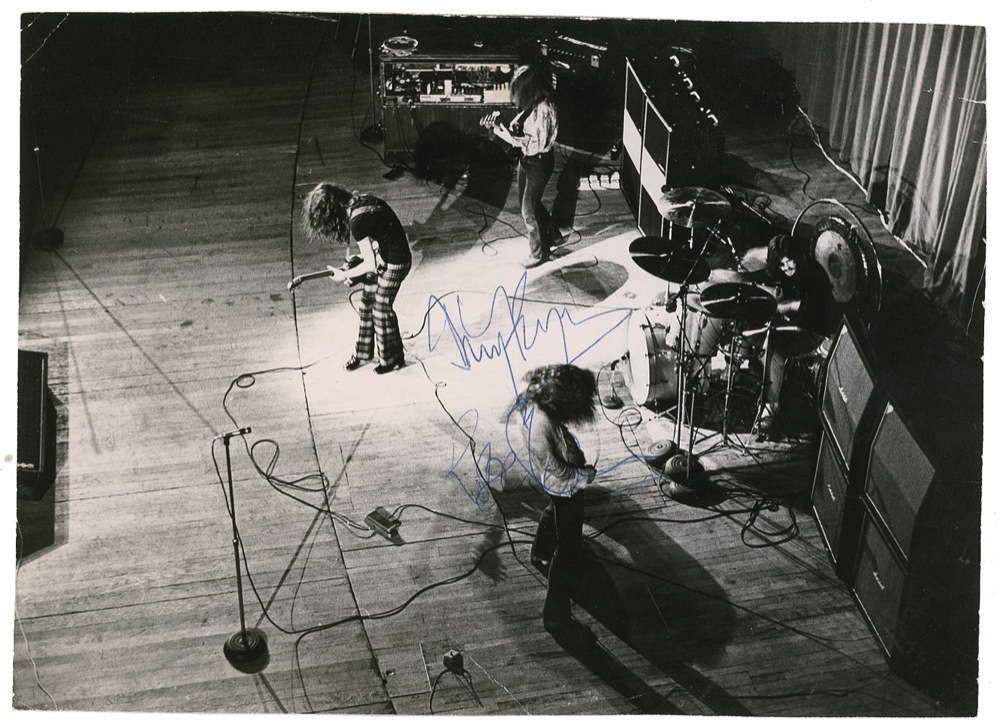 Vintage glossy 9 x 6.5 photo of Led Zeppelin on stage and shot from above, signed in blue ballpoint, “Jimmy Page” and “Robert Plant.” In very good condition, with scattered edge wear, moderate creasing, and trimmed edges. Pre-certified Roger Epperson/REAL and RRAuction COA.