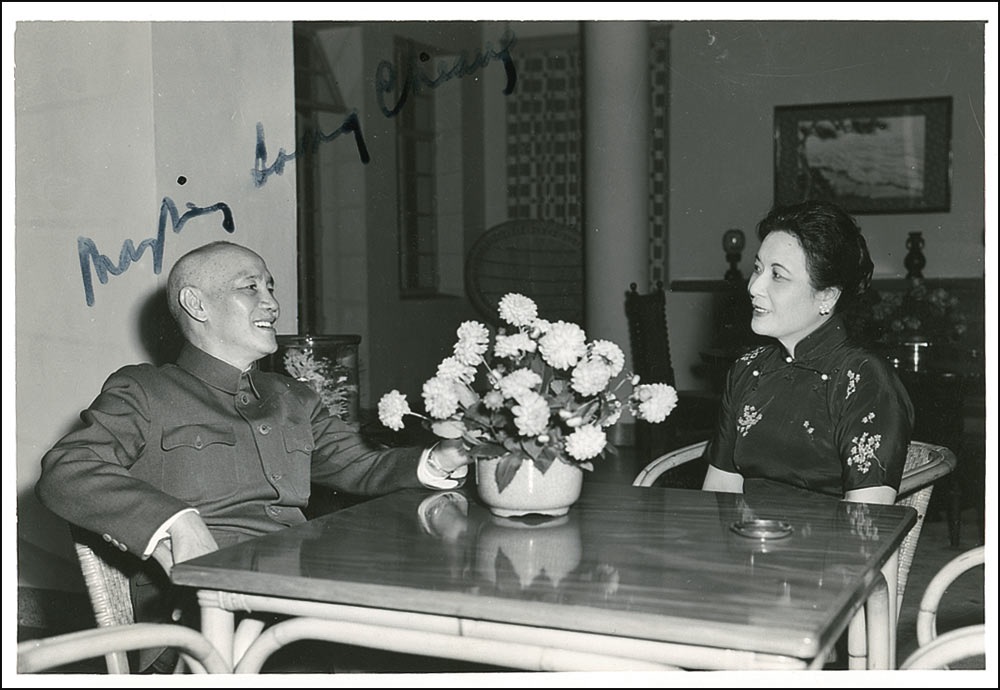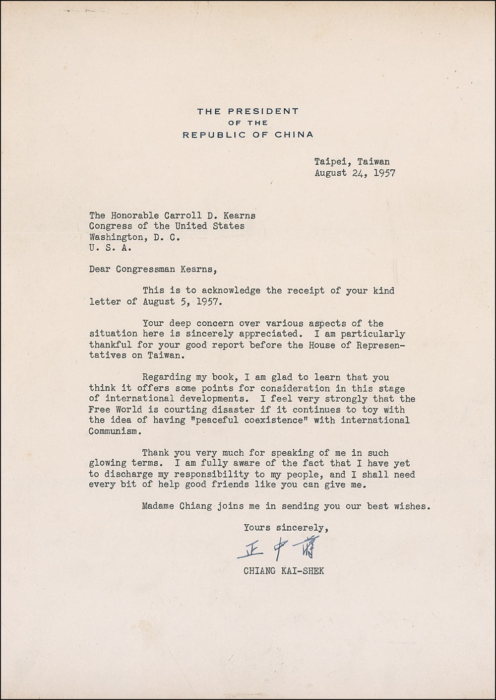 TLS signed in Chinese, one page, 7.75 x 11, President of the Republic of China letterhead, August 24, 1957. Letter to Congressman Carroll D. Kearns of Pennsylvania. In full: “This is to acknowledge the receipt of your kind letter of August 5, 1957. Your deep concern over various aspects of the situation here is sincerely appreciated. I am particularly thankful for your good report before the House of Representatives on Taiwan. Regarding my book, I am glad to learn that you think it offers some points for consideration in this stage of international developments. I feel very strongly that the Free World is courting disaster if it continues to toy with the idea of having ‘peaceful coexistence’ with international Communism. Thank you very much for speaking of me in such glowing terms. I am fully aware of the fact that I have yet to discharge my responsibility to my people, and I shall need every bit of help good friends like you can give me, Madame Chiang joins me in sending you our best wishes.” In fine condition, with some mild edge toning, as well as some light creases and wrinkles. Accompanied by a glossy 5.5 x 3.75 of Chiang Kai-Shek and his wife, signed in black ink “Mayling Soong Chiang.” RRAuction COA.