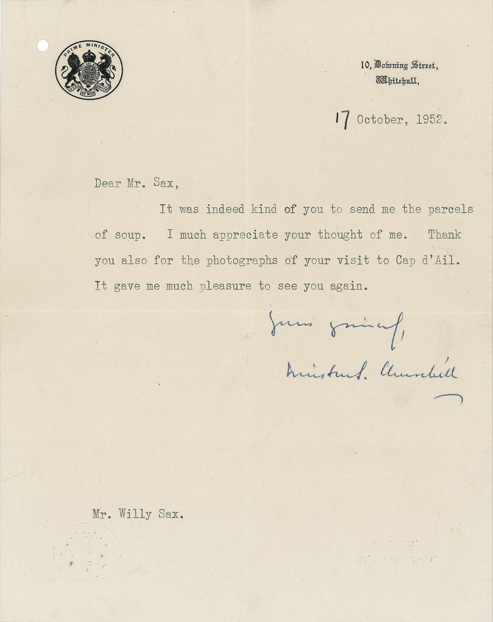 TLS signed “Winston S. Churchill,” one page, 7.5 x 9.5, Prime Minister letterhead, October 17, 1952. Letter to to Willy Sax, in Zurich, Switzerland. In full: “It was indeed kind of you to send me the parcels of soup. I much appreciate your thought of me. Thank you also for the photographs of your visit to Cap d'Ail. It gave me much pleasure to see you again.” In fine condition, with central horizontal and vertical mailing fold, light mirroring of letterhead at bottom, and a punch hole to top left. Accompanied by the original mailing envelope. Pre-certified John Reznikoff/PSA/DNA and RRAuction COA.