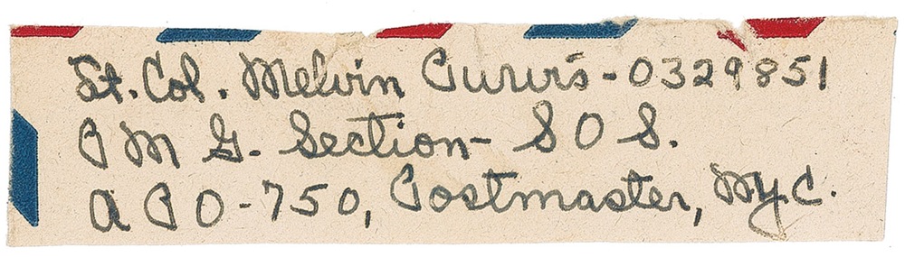 Fountain pen signature, “Lt. Col. Melvin Purvis - 032981, P M G Section - S O S., A P O - 70, Postmaster, NYC,” on an off-white 3.75 x 1 slip cut from a return address. In very good condition, with uniform toning and small tears (one passing through his name) repaired on the back with old tape. RRAuction COA.