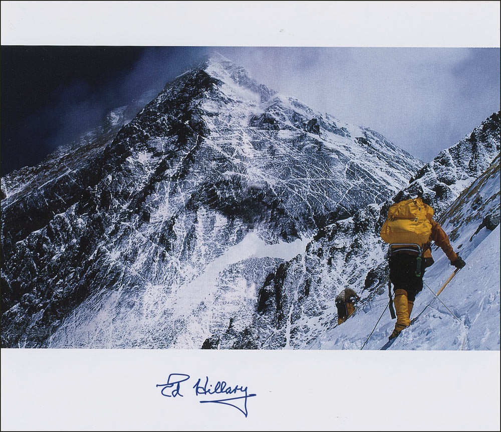 Breathtaking color satin-finish 14 x 12 photo of Hillary ascending Mount Everest, signed in the lower border in blue felt tip. In very fine condition. RRAuction COA.