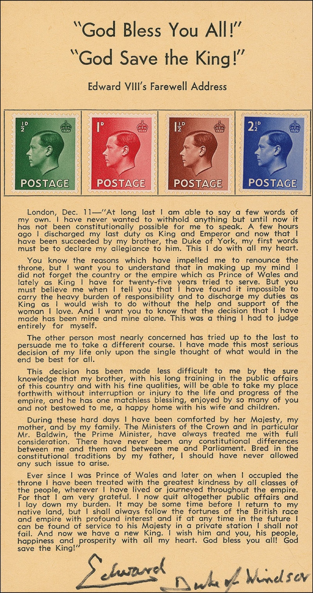 Philatelic souvenir, 3.75 x 7, bearing Edward’s Farewell Address and four commemorative postage stamps, signed along the bottom in black felt tip, “Edward, Duke of Windsor.” In very fine condition. RRAuction COA.