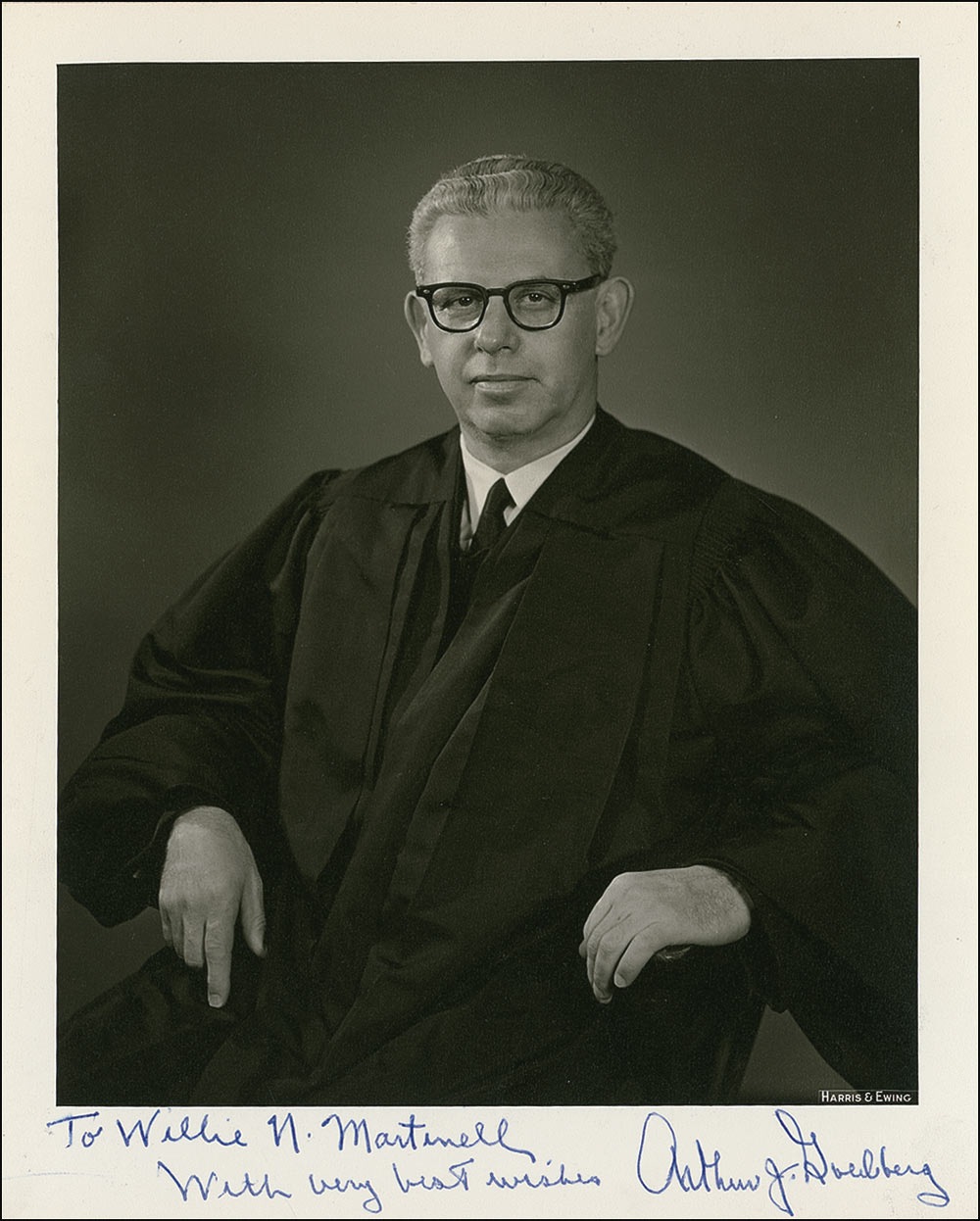 American jurist who served as an associate justice of the US Supreme Court (1962–1965) and a representative to the United Nations (1965–1968). Matte-finish 8 x 10 Harris and Ewing photo of Goldberg in his judicial robe, signed and inscribed in the lower border in blue ballpoint “To Willie N. Martinelli, With very best wishes, Arthur J. Goldberg.” In fine condition. RRAuction COA.